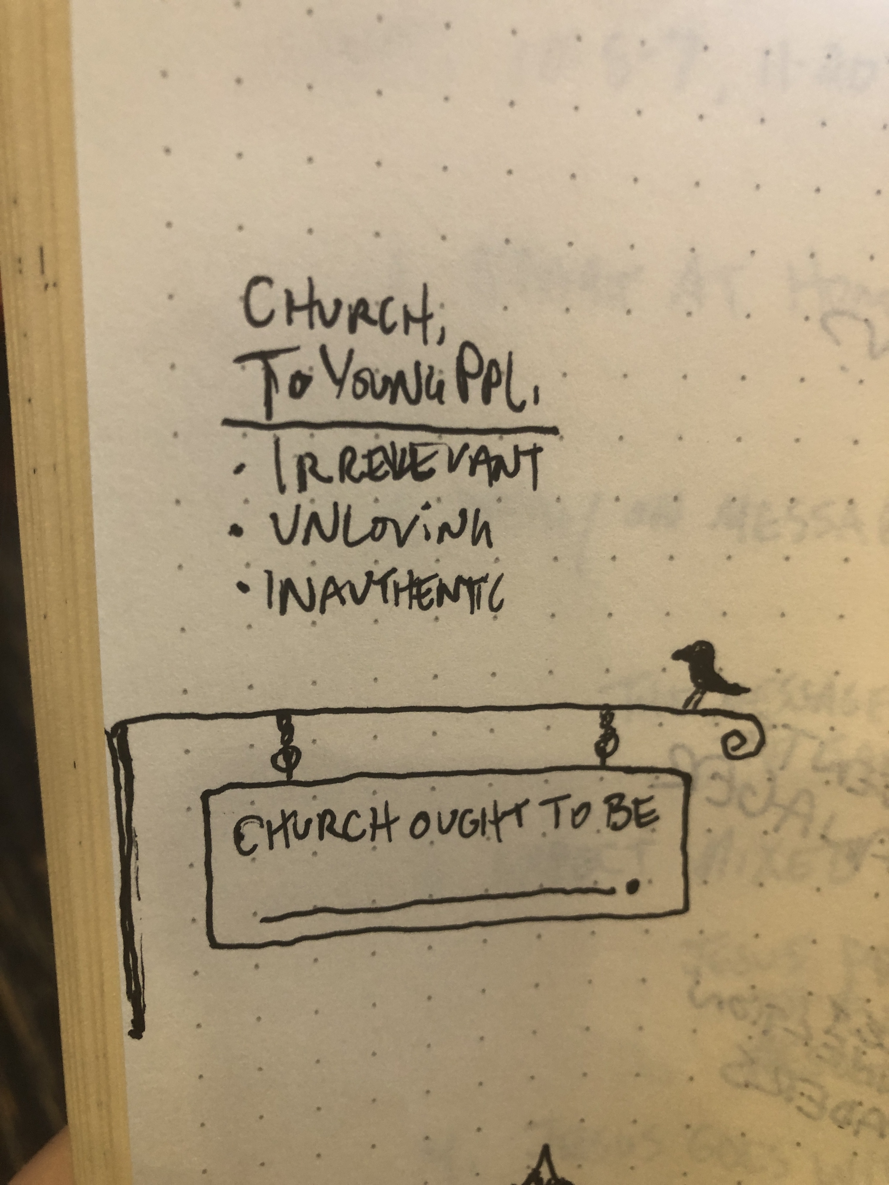 Okay, on to something else I jotted down. The presenter was telling us that according to studies, young people describe church as “irrelevant, unloving, and inauthentic.” I’m going to be gut-level honest here. My first thought was “Well, if they came to MY church or the ministry that I lead, they wouldn’t think that.” But you know what? I can’t remember the last time I even asked the teenagers I interact with week in and week out how they view our church family/spiritual community. Would they say the same thing? Man, I hope not. But I can’t dismiss this just because I want to disagree with it. Reality doesn’t work like that. So I think maybe I’ll ask as many young people as I can to give me the adjectives they’d apply to church. And/or maybe fill in that blank I’ve doodled on that sign hanging over there.