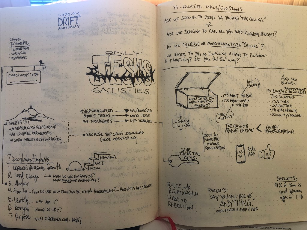 I’ll start by saying that I came into this event with a desire to connect with those specifically ministering to and among young adults. In my ministry context, we define that as 18-30 year olds. In January of 2022, “Pastor to Young Adults” was added to my role of “Pastor to Students”, a role I’ve held at Southside Church in the Richmond area of Virginia since 2004. So if you’re in middle school up to age 30ish, the lion’s share of my thoughts, wonderings, ideas, plans, and everyday breathing is revolving around you, where you are, what you’re doing, what you’re struggling with, how you’re growing, what your fears are, and how I can best encourage, support, and offer help to you, whoever you are and wherever you are.
